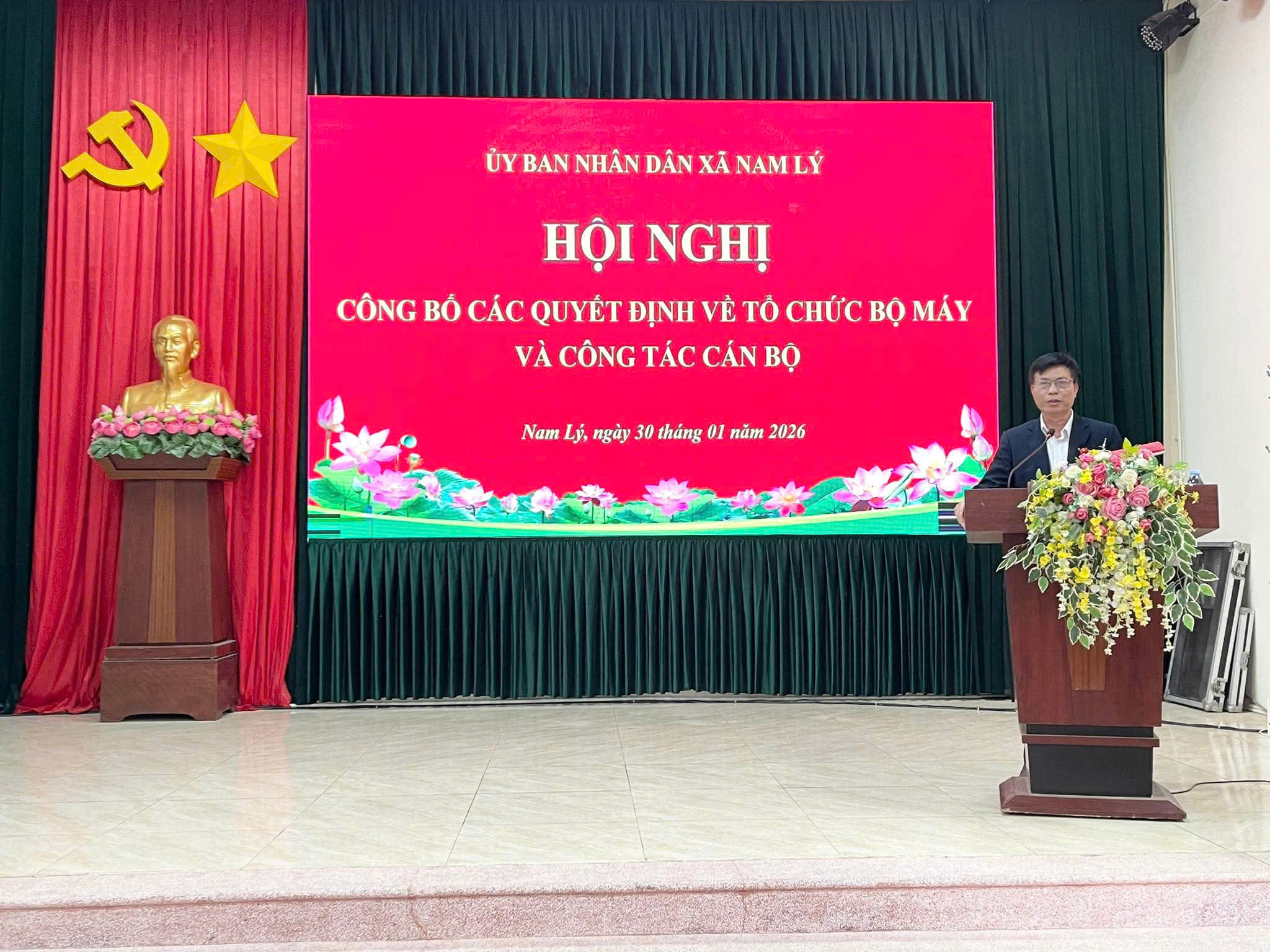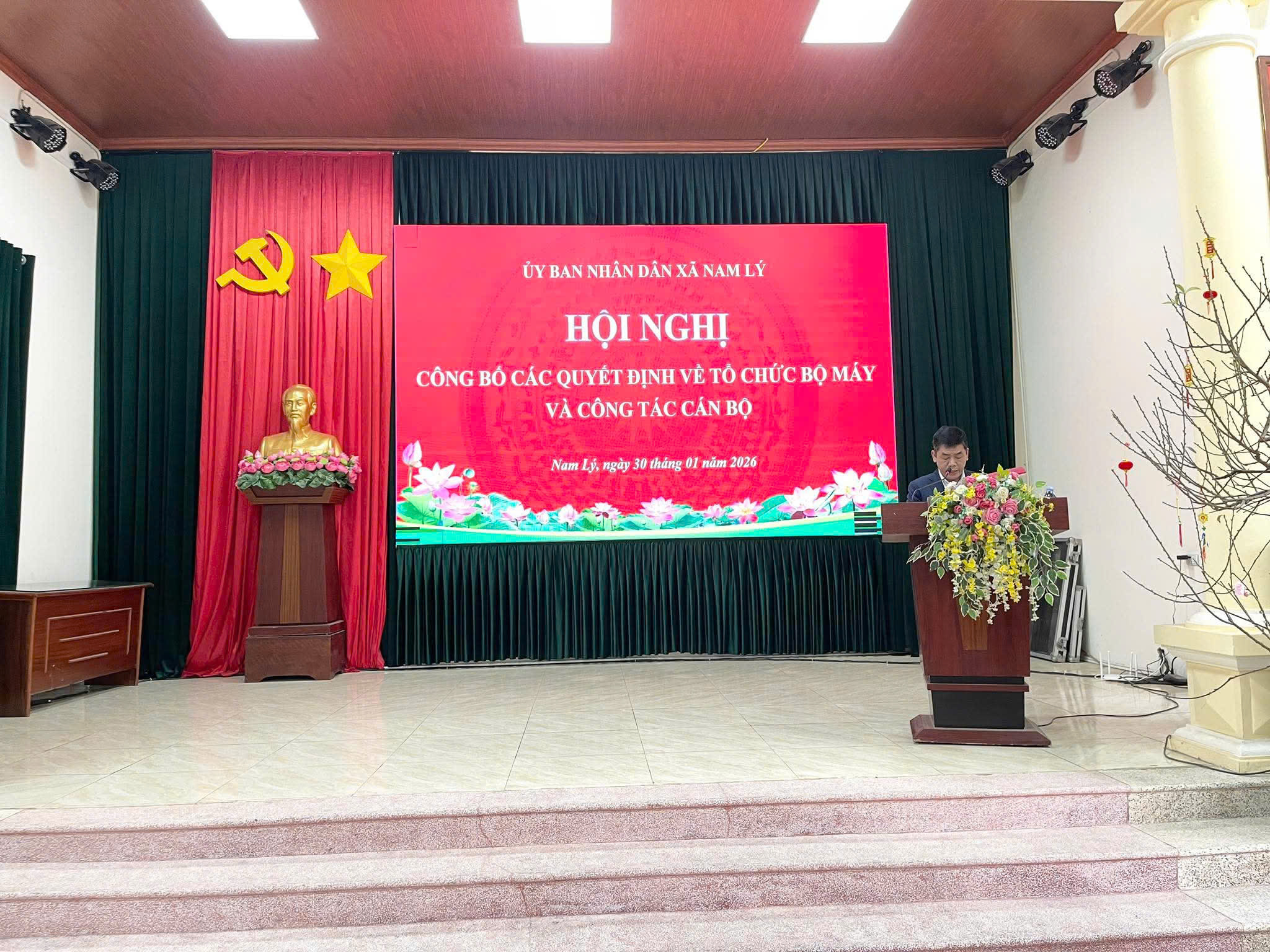 Sáng ngày 30/01/2026 UBND xã Nam Lý tổ chức hội nghị công bố các Quyết định về tổ chức bộ máy và công tác cán bộ. Dự hội nghị có các đồng chí trong Thường trực Đảng uỷ; các đồng chí Ủy viên Ban Thường vụ Đảng ủy, Thường trực HĐND; Lãnh đạo UBND xã; Chỉ huy Ban Chỉ huy Quân sự xã; Lãnh đạo các phòng chuyên môn thuộc UBND xã, Lãnh đạo, giáo viên Trường Tiểu học Nhân Hòa, Trường Tiểu học Nhân Hậu.