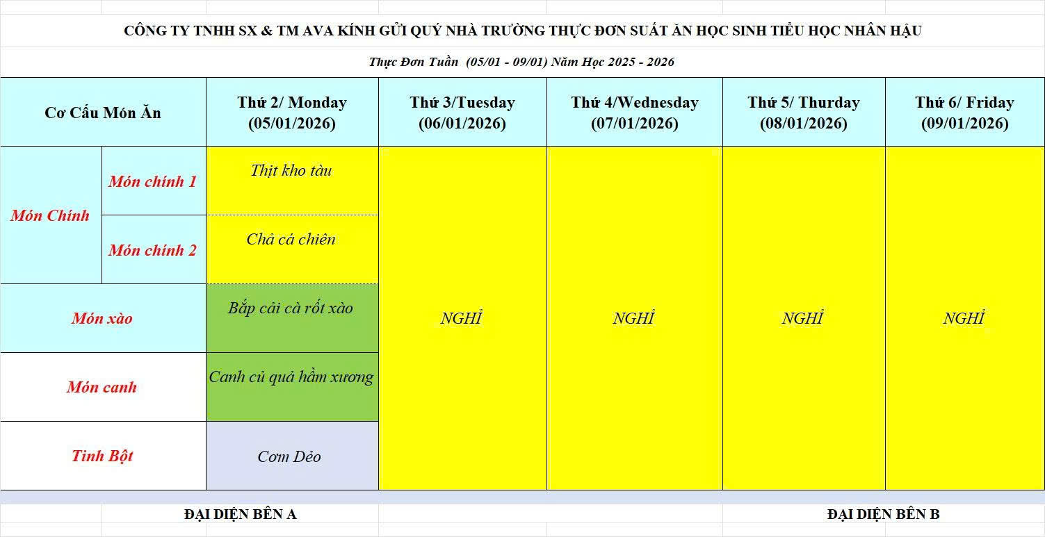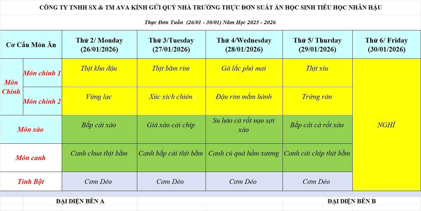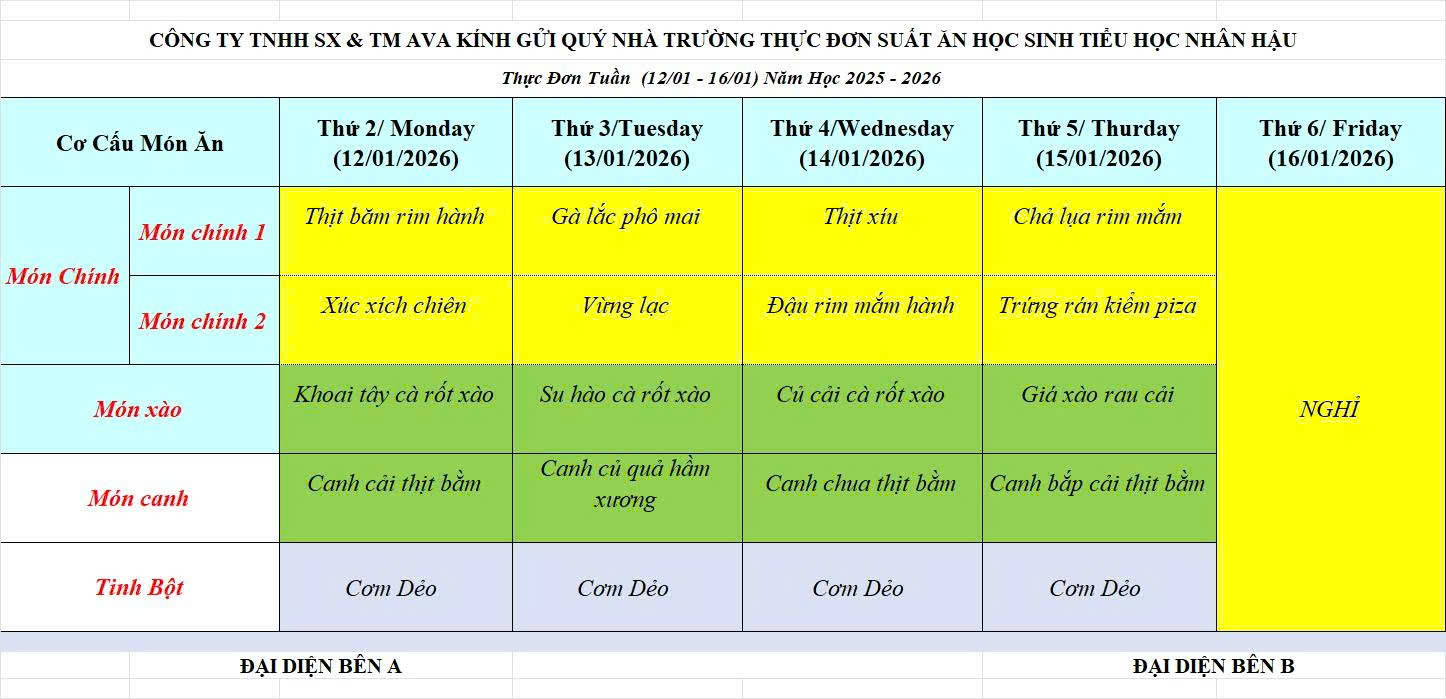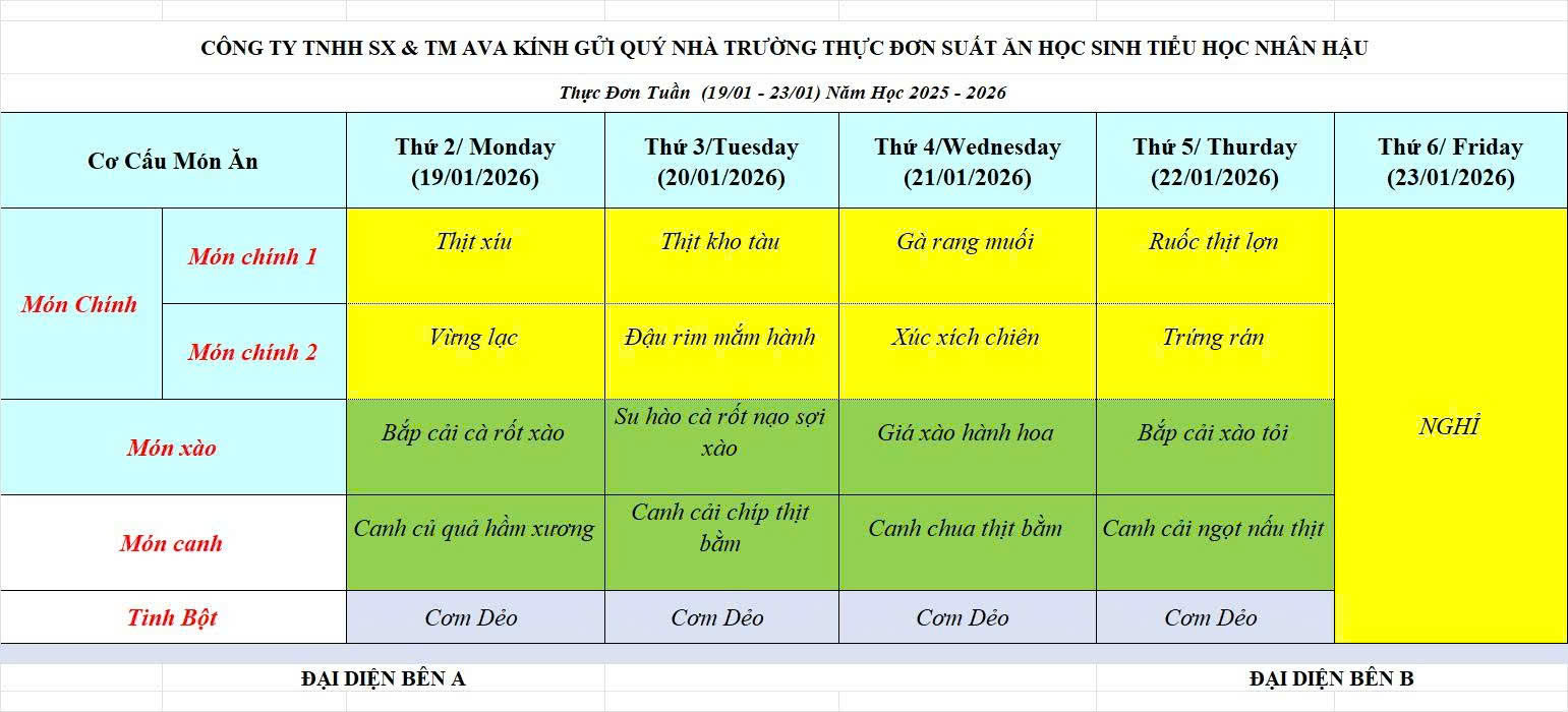 THỰC ĐƠN BÁN TRÚ THÁNG 1 NĂM 2026