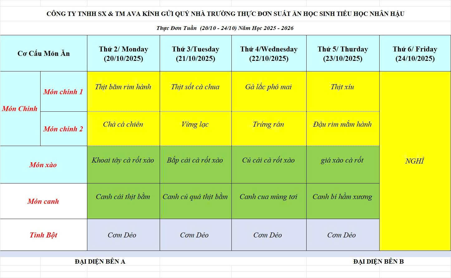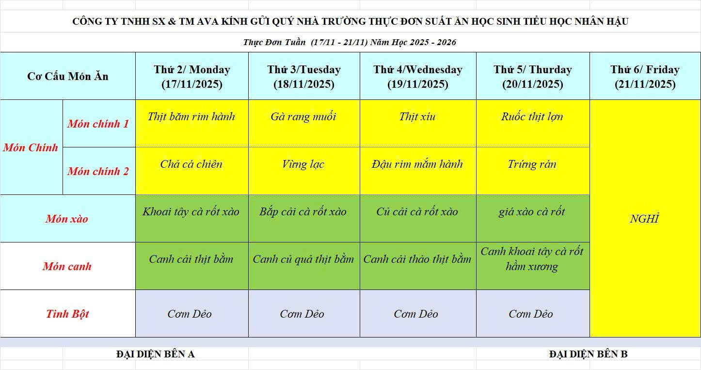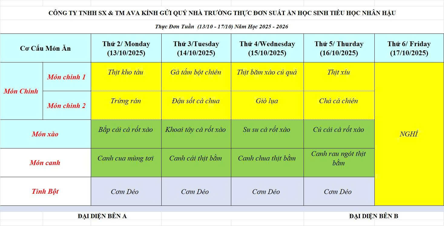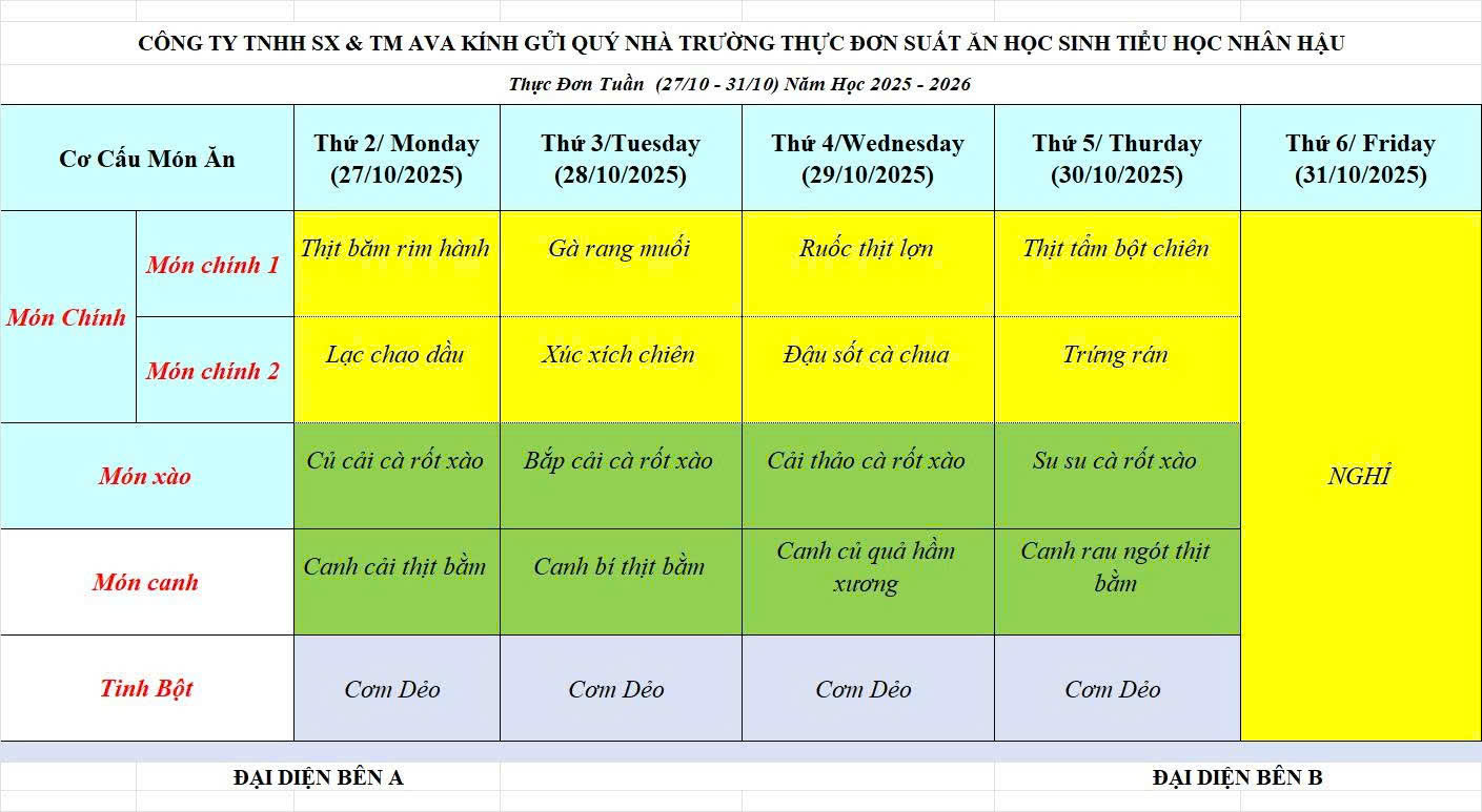 THỰC ĐƠN BÁN TRÚ THÁNG 10 NĂM 2025