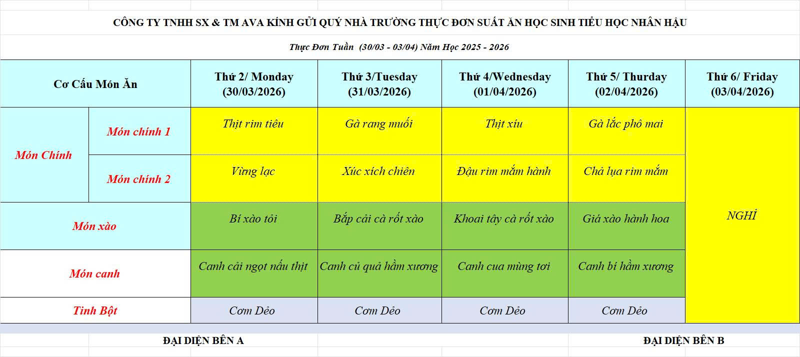 THỰC ĐƠN BÁN TRÚ THÁNG 3 NĂM 2026
