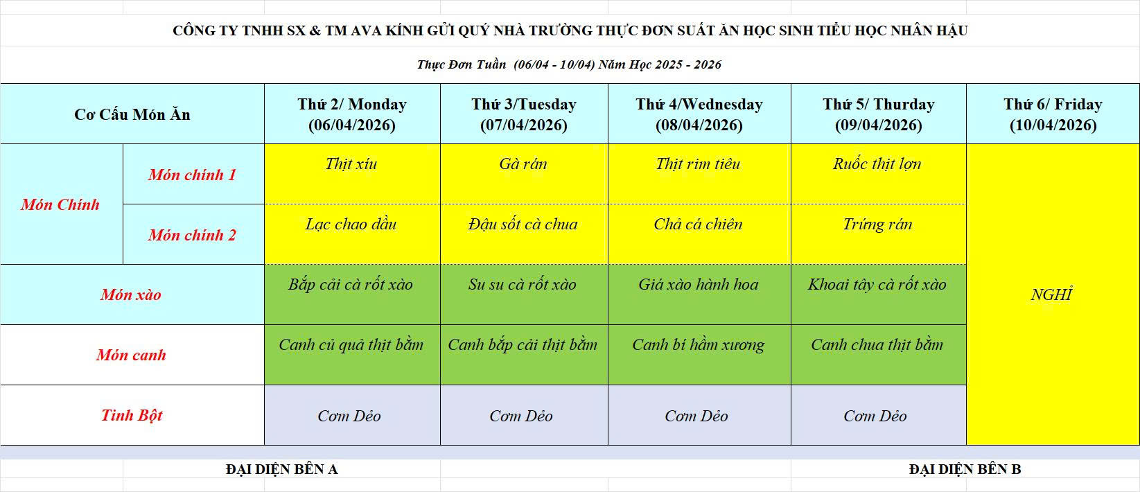 THỰC ĐƠN BÁN TRÚ THÁNG 4 NĂM 2026