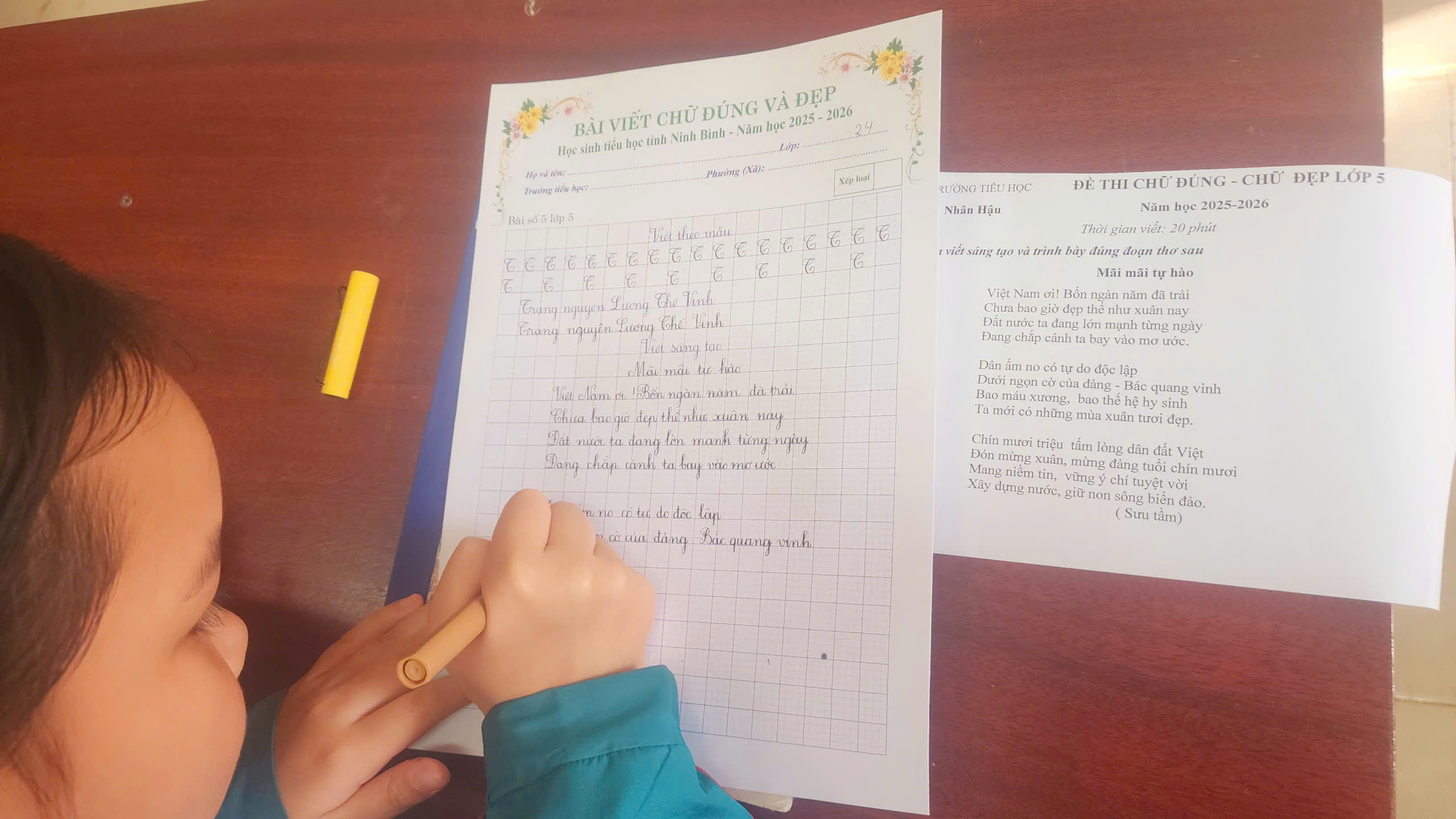 Chiều ngày 26/12/2025, Trường Tiểu học Nhân Hậu đã tổ chức Hội thi “Chữ Việt đẹp” cấp trường năm học 20254-2026. Hội thi cũng là dịp để các em học sinh có cơ hội bộc lộ tài năng và sự sáng tạo của mình trong từng nét chữ. Mỗi bài viết là thành quả của một quá trình rèn luyện vất vả với sự tập trung cao độ của các bạn học sinh trong nhà trường.