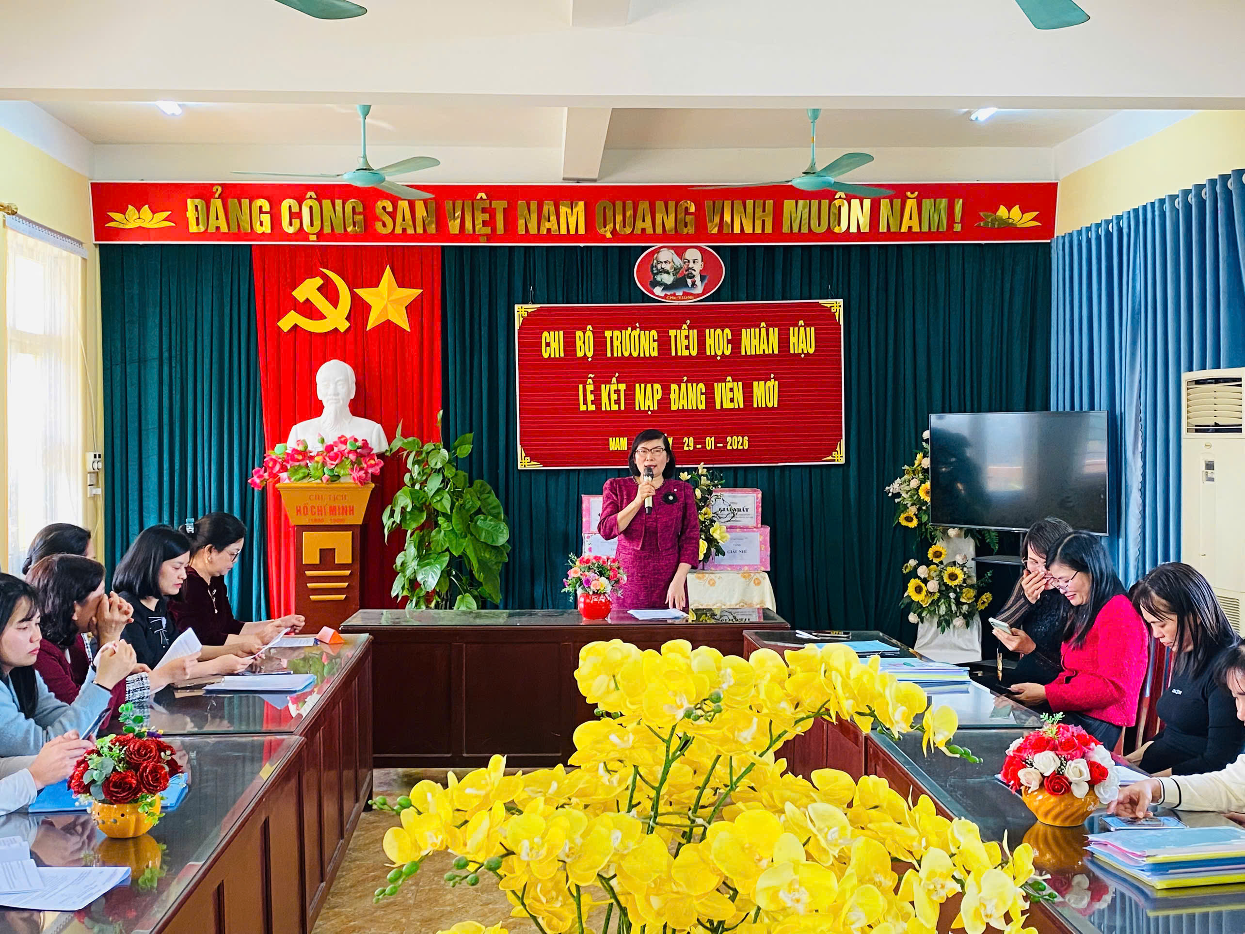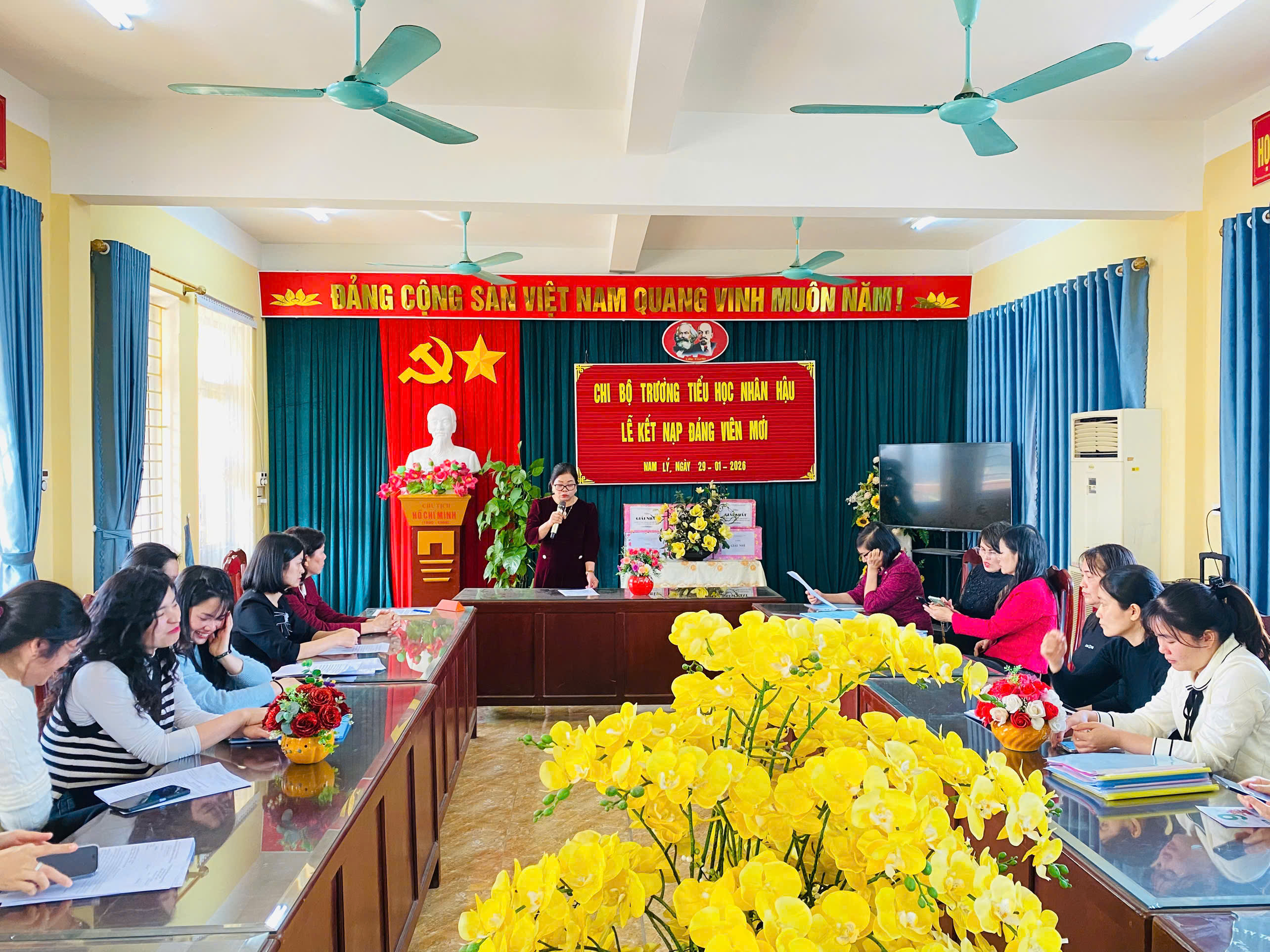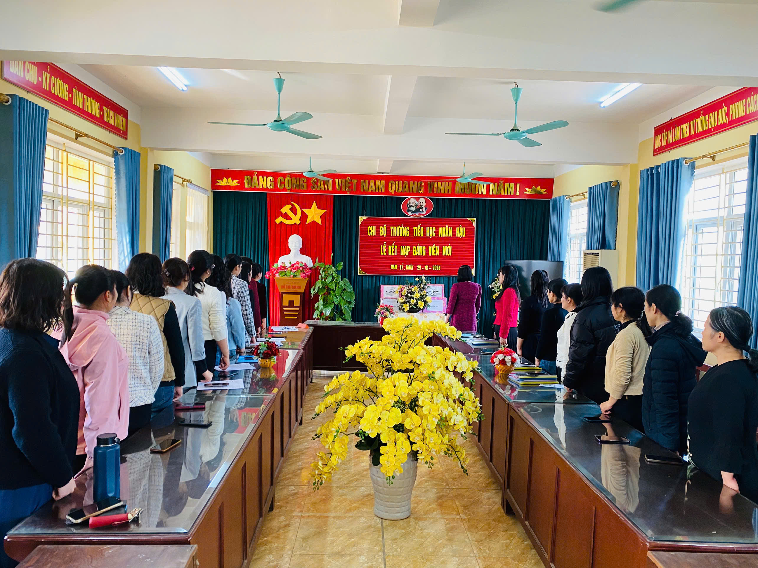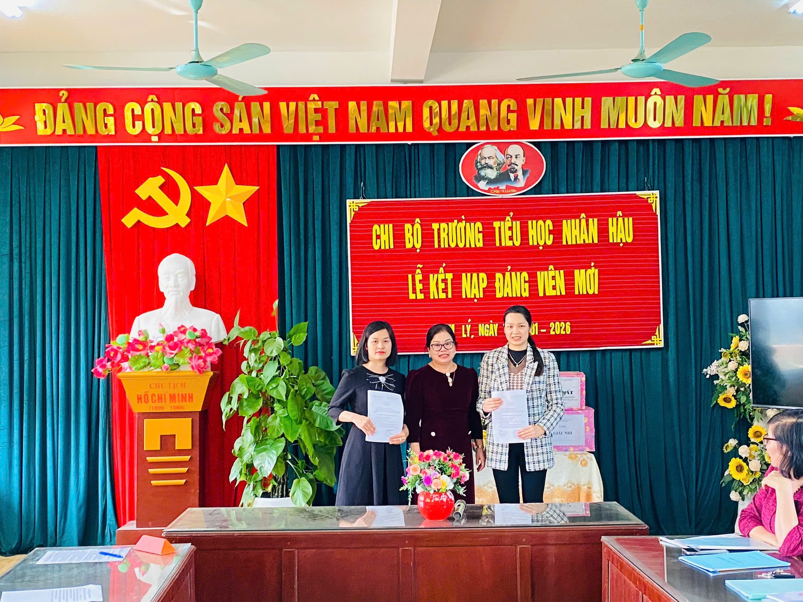 Thực hiện kế hoạch của nhà trường và được sự nhất trí của Đảng uỷ xã Nam Lý, sáng ngày 29/01/2026 Chi bộ trường Tiểu học Nhân Hậu long trọng tổ chức lễ kết nạp Đảng viên cho quần chúng ưu tú cho 2 đồng chí là: đồng chí Trần Thị Thúy-GVCN 3E và đồng chí Trần Thị Lan Hương-GV Mĩ thuật.